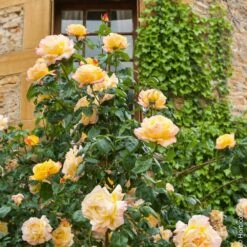 Jouez avec l’effet bicolore rouge/jaune de l’abutilon megapotamicum en compagnie du superbe rosier grimpant COCKTAIL ® Meimick aux belles églantines simples rouges à cœur jaune.