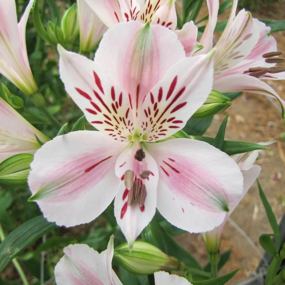 Dotée d’une longue floraison continue de juin aux gelées, l’alstroemère Béatrice offre avec une continuité peu commune ses charmantes fleurs groupées en bouquets au sommet de ses tiges. Ses corolles d’aspect exotique se teintent d’un délicat rose pâle nuancé et marginé de blanc, parfois légèrement marqué de vert à l’extrémité des pétales, avec au cœur des stries rouge brunâtre bien marquées.