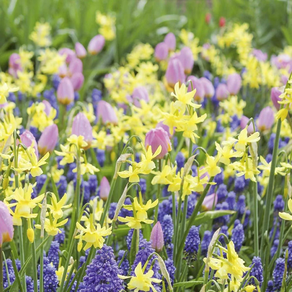 Un mélange frais, composé de 20 tulipes botaniques Saxatilis + 20 narcisses botaniques Hawera et 20 muscaris d’Arménie.