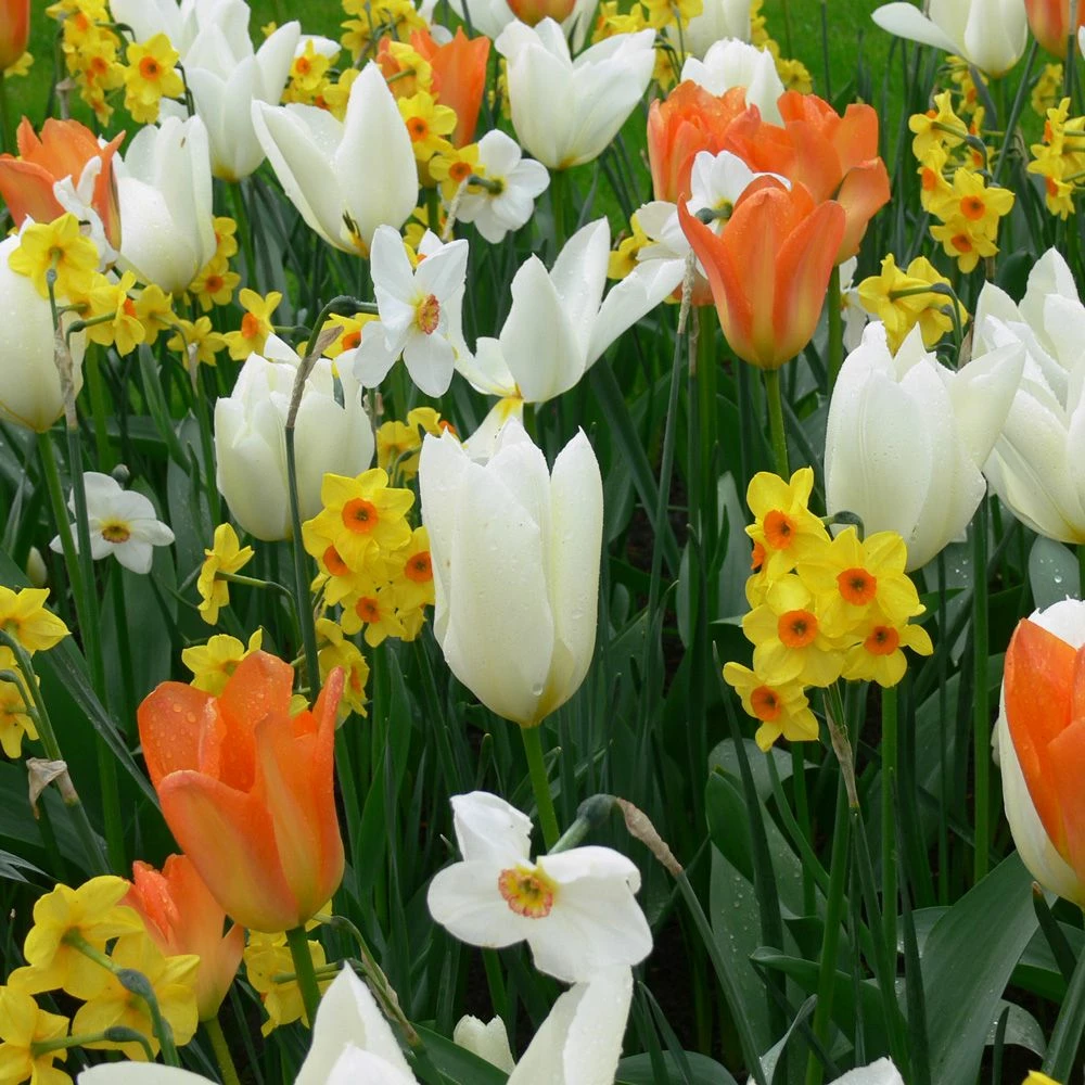 Doté d’une floraison à la fois précoce et prolongée, l’assortiment Madagascar s’épanouit dans un camaïeu chaud et lumineux durant 2 à 3 semaines courant mars en climat moyen de plaine. Ses deux tulipes fosteriana exhibent de superbes fleurs épurées et élégantes blanches et oranges, valorisées par le narcisse pluriflore aux multiples petites corolles jaunes et orange et le narcisse blanc à cœur jaune cuivré pour une touche de lumière.