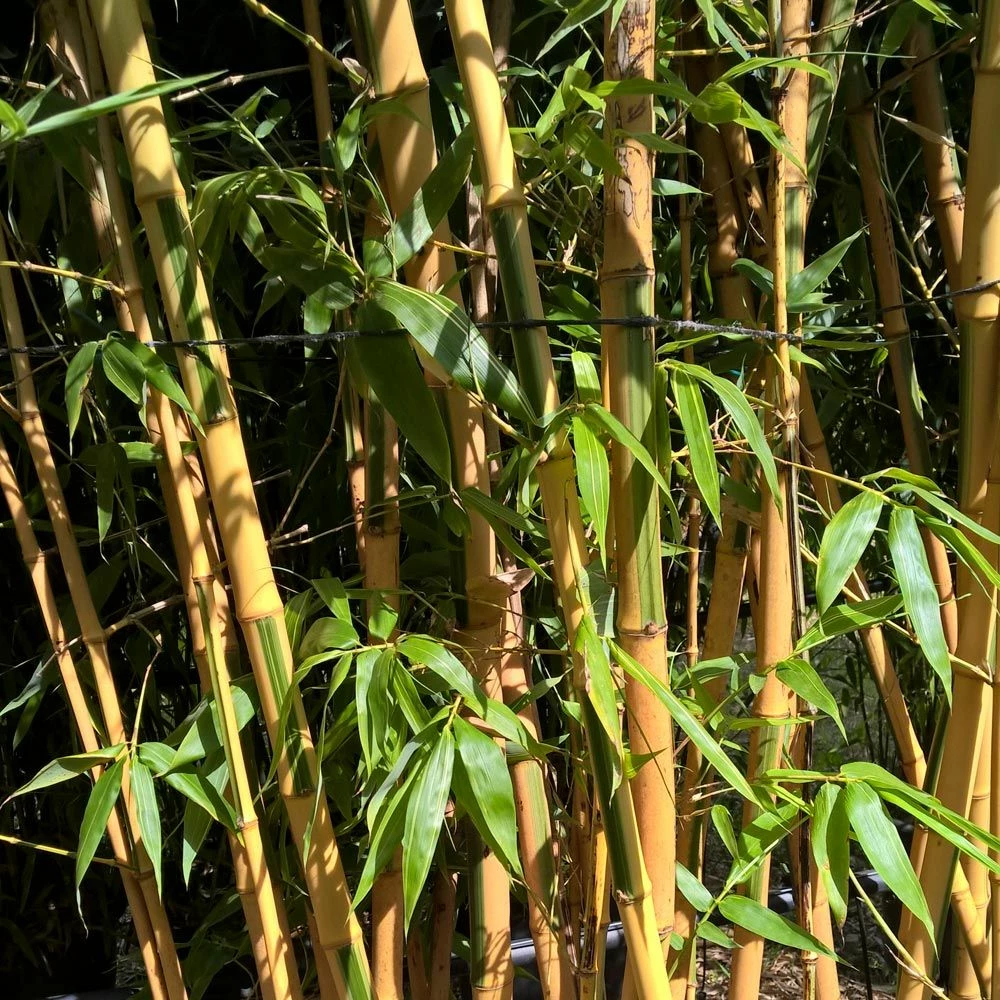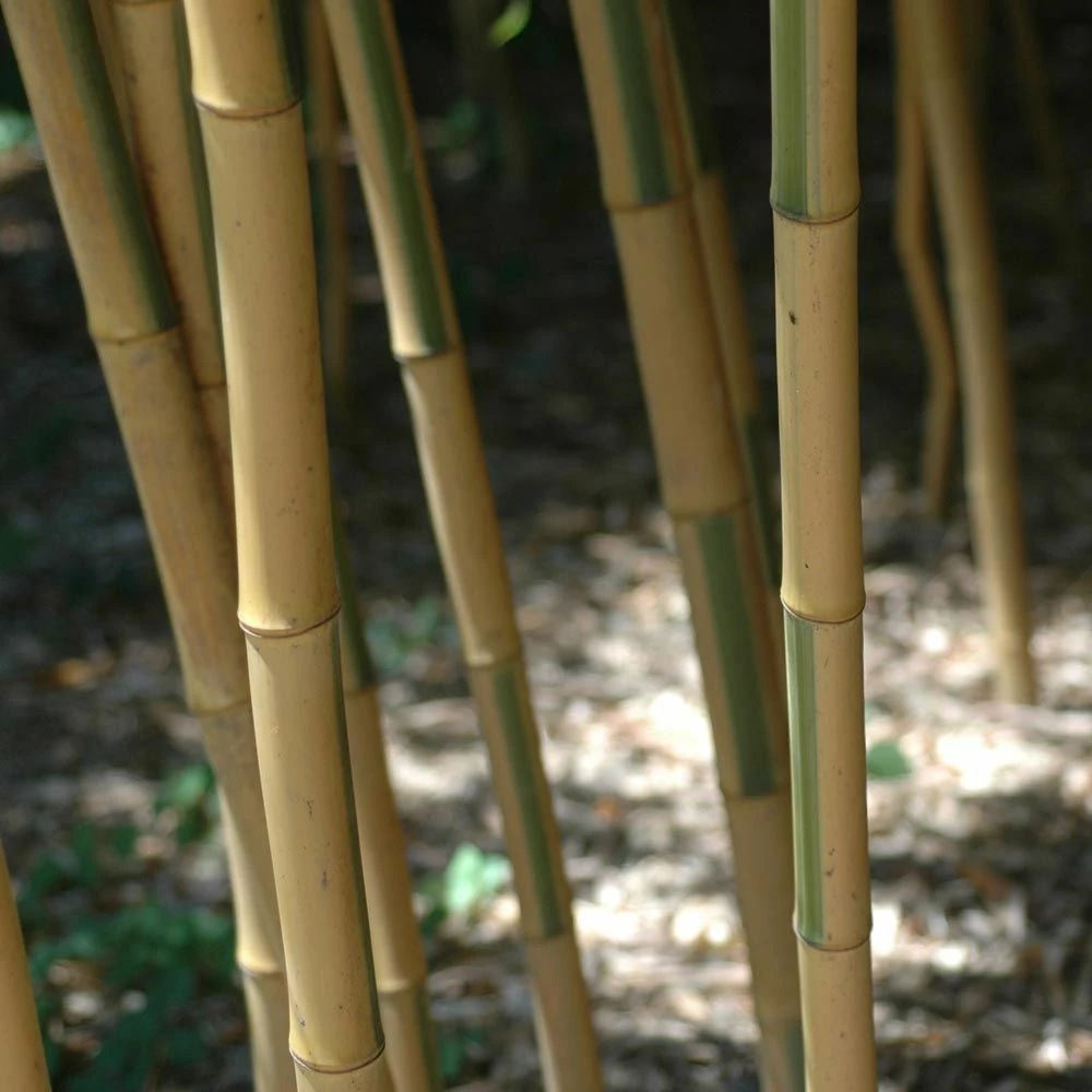 Le Bambou Phyllostachys Bambusoides Castillonis possède des chaumes jaune d’or striés de vert. Ces stries sont irrégulières sur les entrenœuds de la base. Son feuillage vert sombre lustré et légèrement panaché de blanc-crème est plus dense à la base que la majorité des bambous géants.