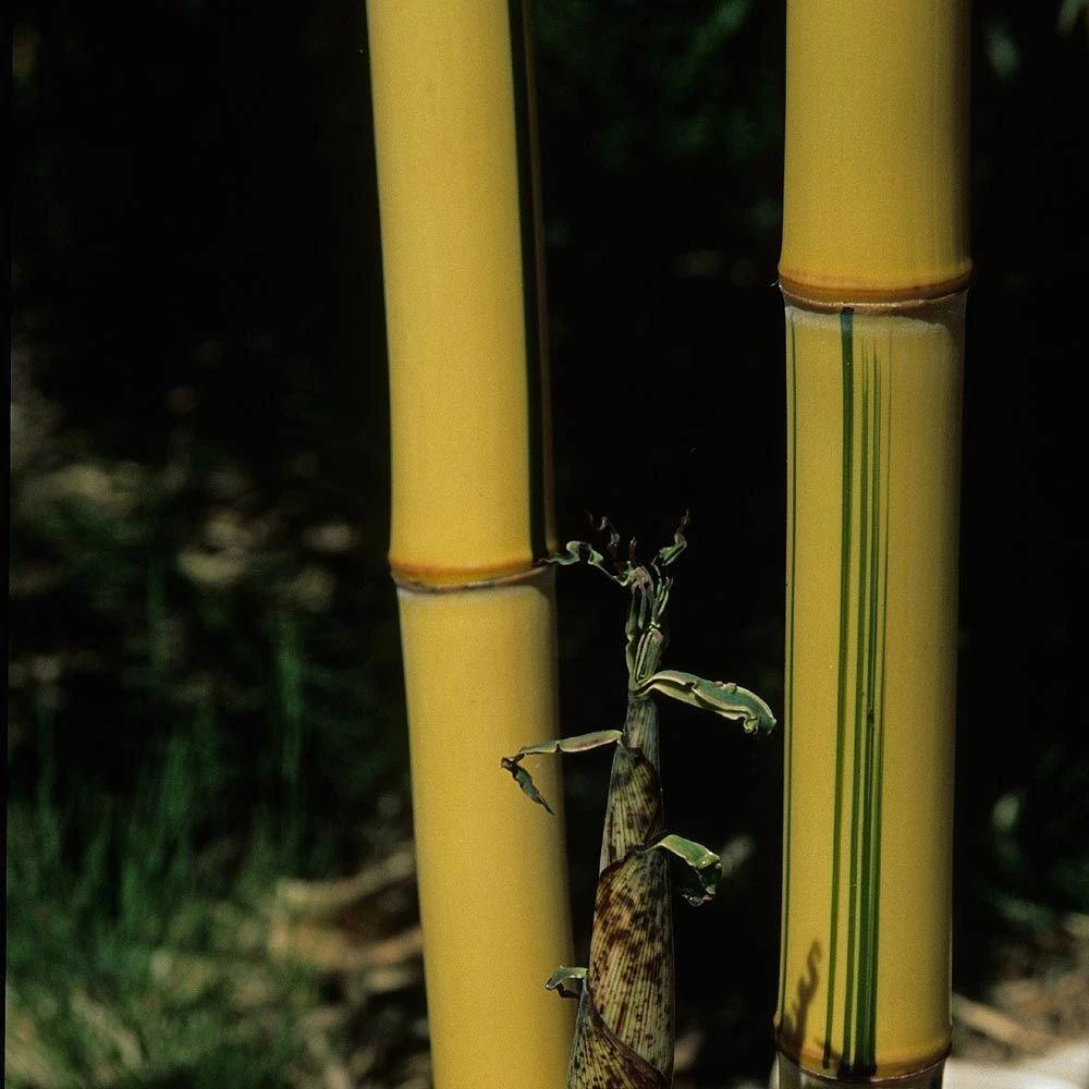 Les chaumes du Bambou Phyllostachys Vivax Aureocaulis sont totalement jaunes avec quelques rares et discrètes rayures vertes sur certains entrenœuds.