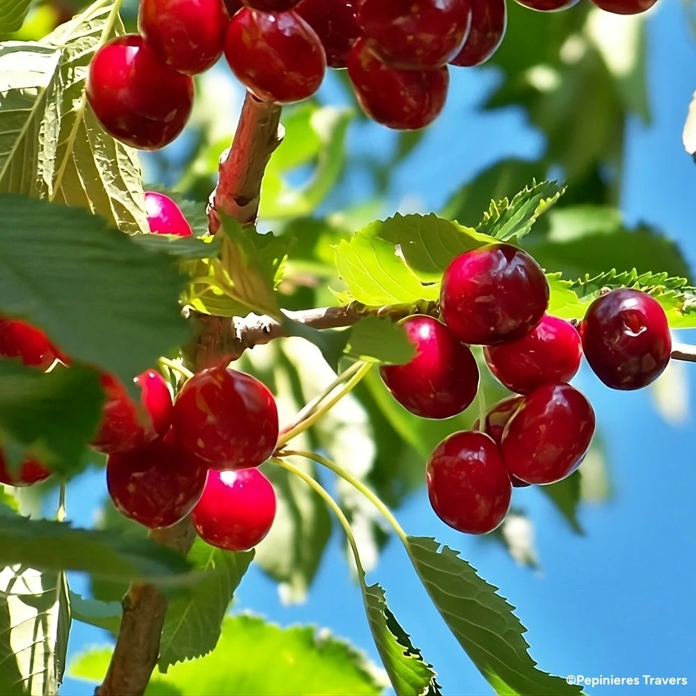 L’arrivée du printemps est célébrée par une floraison abondante qui transforme ce petit arbre en un spectacle de couleurs, annonçant une récolte généreuse dès juin. Les cerises, d’un rouge profond et charnues, sont non seulement un régal pour les yeux mais aussi pour le palais, avec leur richesse en vitamine C et minéraux.