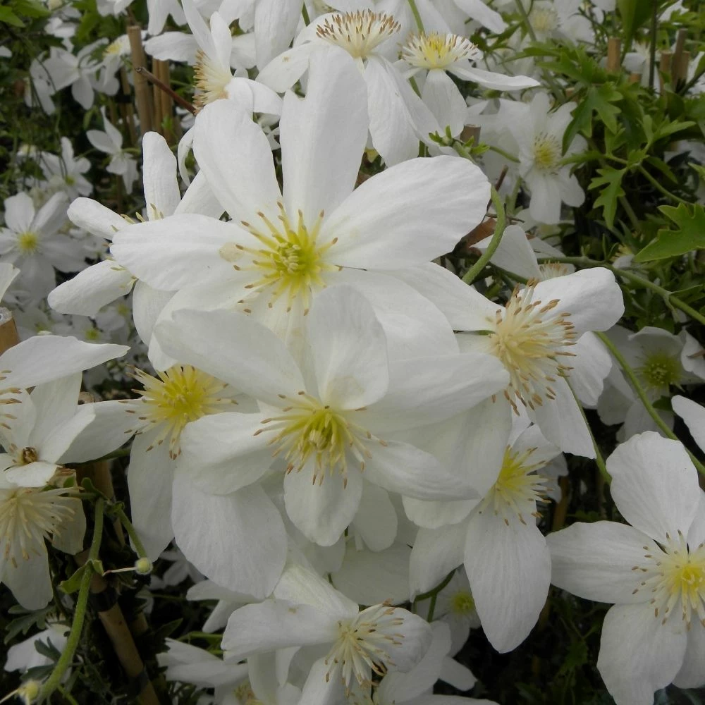 La clématite X cartmanii AVALANCHE ® ‘Blavaal’ porte bien son nom ! En mars-avril, voire dès février en climat doux, elle produit une avalanche de petites fleurs blanc crème d’environ 5 à 9 cm de diamètre au cœur d’étamines jaunes. Groupées en bouquets denses le long les pousses de l’année précédente, elles recouvrent le joli feuillage persistant qui leur sert d’écrin. Très décoratives, ses feuilles sont découpées à la manière du persil et s’habillent d’un profond vert intense, légèrement bronze sur les jeunes pousses.