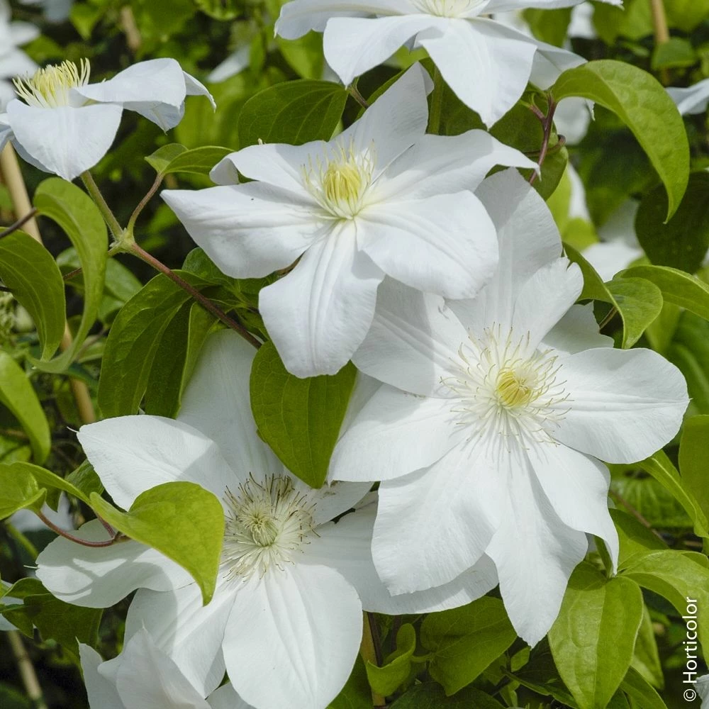La plus célèbre des clématites à grandes fleurs blanches ! Variété classique créée en France en 1885, la clématite ou Clematis X ‘Mme Lecoultre’ charme toujours autant par la beauté de sa floraison remontante que par sa facilité de culture. Ses grandes fleurs étoilées blanc pur s’épanouissent en juin-juillet puis de nouveau en septembre, sur une plante grimpante vigoureuse et très robuste. Cette clématite indémodable s’associe joliment aux rosiers grimpants.
