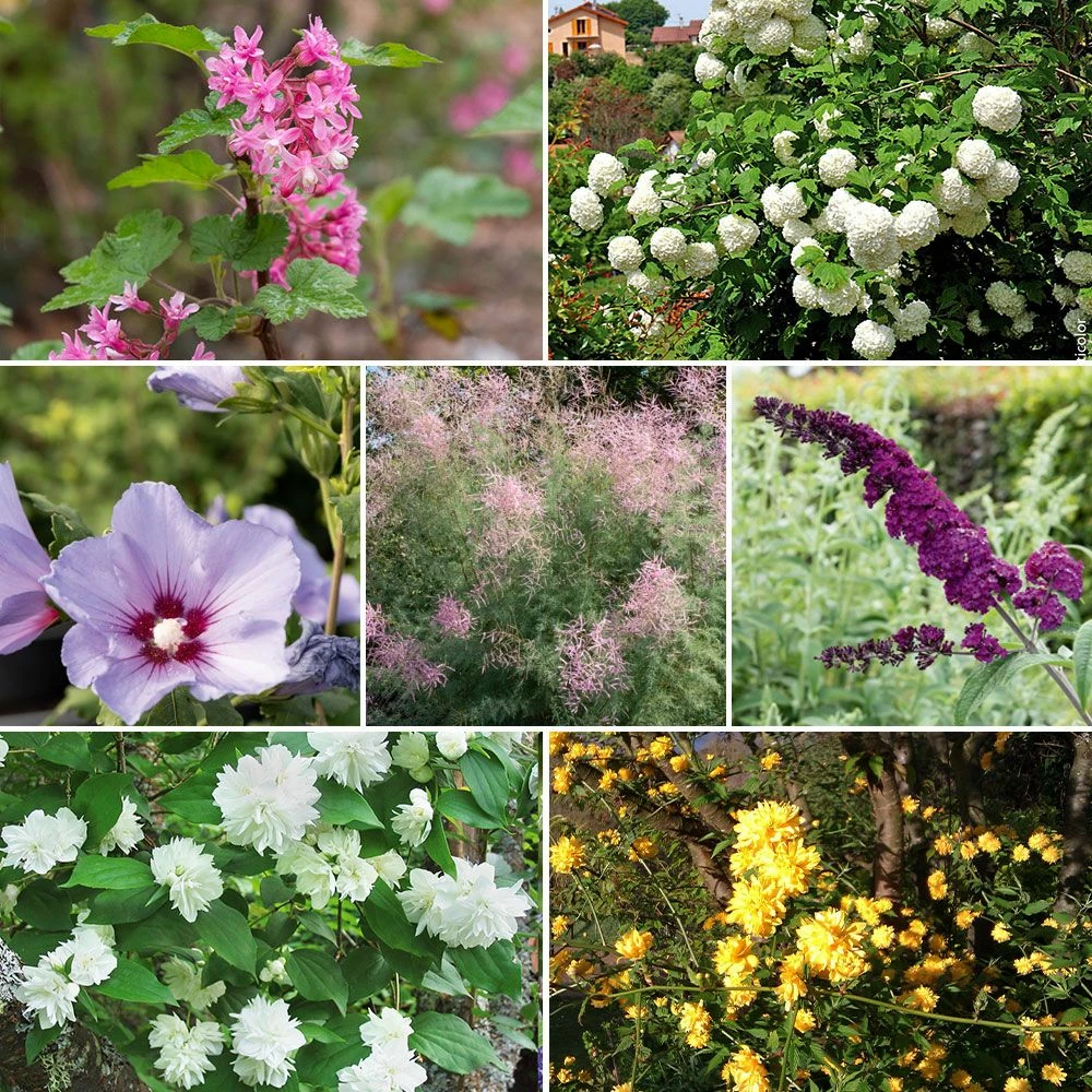 Compositions d’arbustes hauts pour une haie multicolore ! Floraison échelonnée d’avril à septembre (distance de plantation 1m/1,20 m.). Dimension adulte de la haie : longueur 9 m, largeur 1,25 m, hauteur environ 2 m.