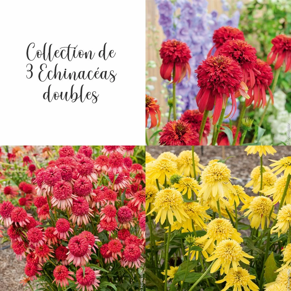 Notre collection exclusive d’Echinaceas à fleurs doubles regroupe 3 variétés exceptionnelles cultivées en pot de 1 litre, emballées et étiquetées séparément :