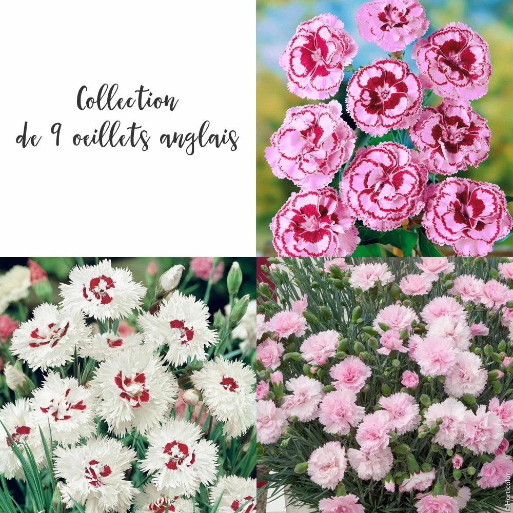 Une collection de 6 œillets Anglais, spécialement adaptés pour les bordures. Ils produisent des fleurs doubles très parfumées, de mai à juillet ainsi qu’en septembre.