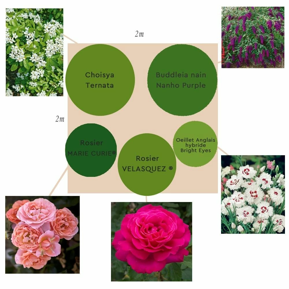 J’ai créé cette assocation florale de 2 m x 2 m qui réunit avantageusement 5 belles plantes pour apporter parfums et floraisons échelonnées d’avril à octobre dans votre jardin. Cela devrait ravir vos sens, à ne pas en douter… Comme il n’est pas toujours facile de créer soit-même ce type de massifs colorés et parfumés, j’ai sélectionné ces vivaces et arbustes qui allient facilité d’entretien à un maximum de fleurs et donc de parfums !