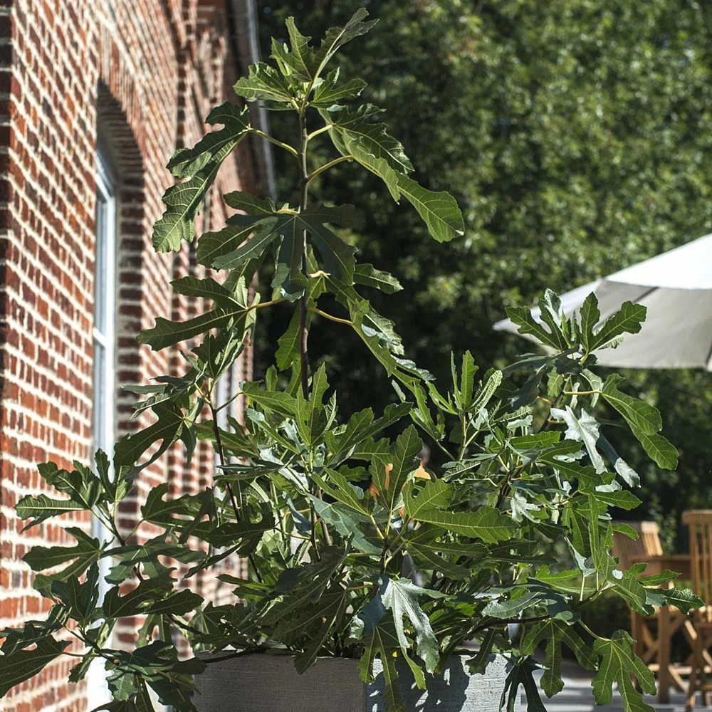 Vigoureux, le figuier nain FIGALITY ® pousse en buisson touffu et compact qui mesure à taille adulte environ 1,5 m de haut et de large. Ses branches fortes portent de belles et grandes feuilles caduques vert foncé, lustrées et profondément découpées, d’aspect exotique et luxuriant.