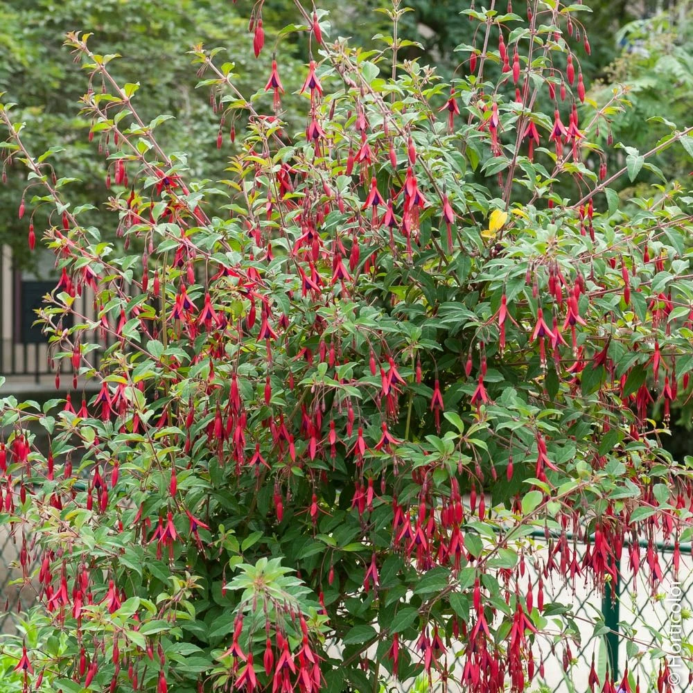 Le Fuchsia Riccartonii est une superbe plante vivace très florifère, à fleurs rouge pourpre et corolles violettes. En région froide les rameaux disparaissent l’hiver mais se reforment au printemps. Les fuchsias arbustifs sont spectaculaires en petits groupes de 3, en haie ou en pot. Ils se marient bien aux massifs de vivaces et d’arbustes. Une plante à port dressé, très vigoureuse. C’est le plus rustique des fuchsias.