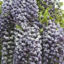 Dotée d’une vigueur peu commune et d’une croissance rapide, la glycine du Japon ‘Violacea Plena’ peut facilement atteindre 10 à 12 m de haut et couvrir jusqu’à 25m² et plus ! Volubiles, ses longues lianes souples s’enroulent solidement sur leur support, dans le sens des aiguilles d’une montre. Elles s’habillent d’un abondant feuillage composé caduc d’un beau vert vif. Avant de tomber en automne, ses feuilles prennent fréquemment des teintes jaune ocré à brun clair. Les nouvelles feuilles se développeront en même temps que les fleurs en mai.