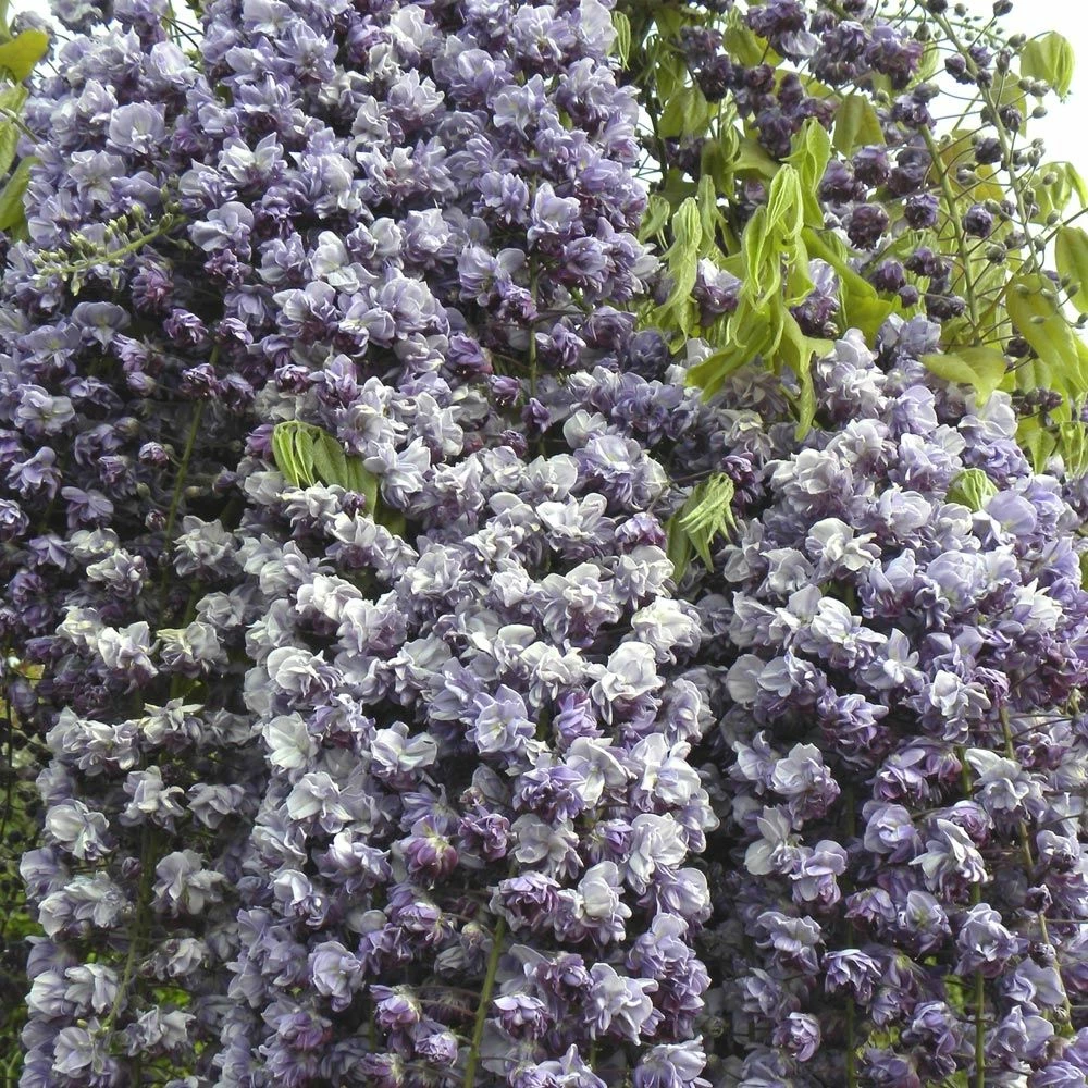 L’abondante floraison en mai-juin de la glycine du Japon ‘Violacea Plena’ est une véritable curiosité végétale. C’est un spectacle à ne manquer sous aucun prétexte ! La glycine ‘Violacea Plena’ produit de belles grappes de 30 à 40 cm de longueur qui s’épanouissent progressivement de la base à l’extrémité. Elles portent de nombreuses petites fleurs doubles très curieuses, chiffonnées comme des pompons miniatures, teintées d’un magnifique violet intense à peine nuancé de mauve. Ces petites corolles étonnantes répandent un délicieux parfum de miel surtout perceptible par temps chaud.