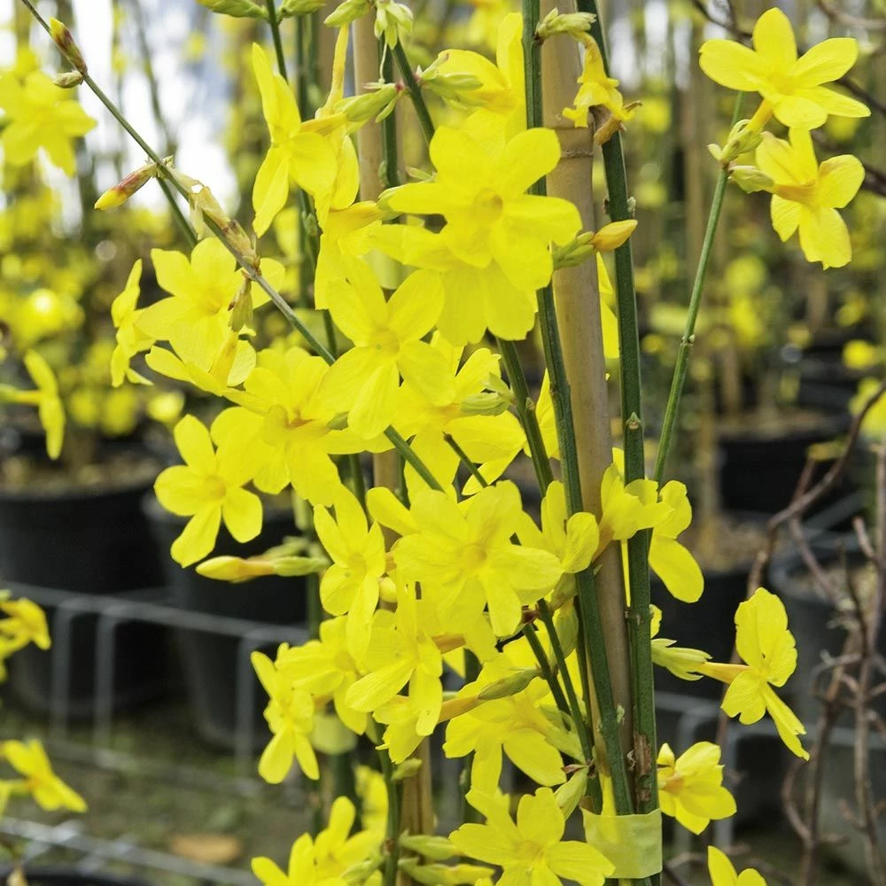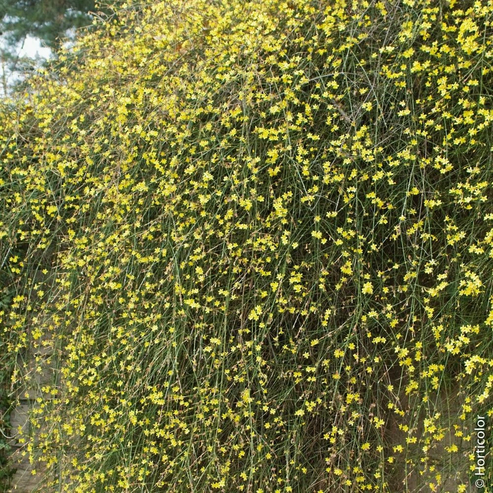 Plein de qualités, le jasmin d’hiver a la particularité de fleurir pendant l’hiver, de décembre à avril alors que les autres fleurs sont encore rares. Plante vigoureuse au feuillage vert foncé disparaissant l’hiver pour laisser place à de nombreuses fleurs jaunes. Convient en tous sols et toutes expositions. Idéal pour palisser un mur ou en couvre-sol.