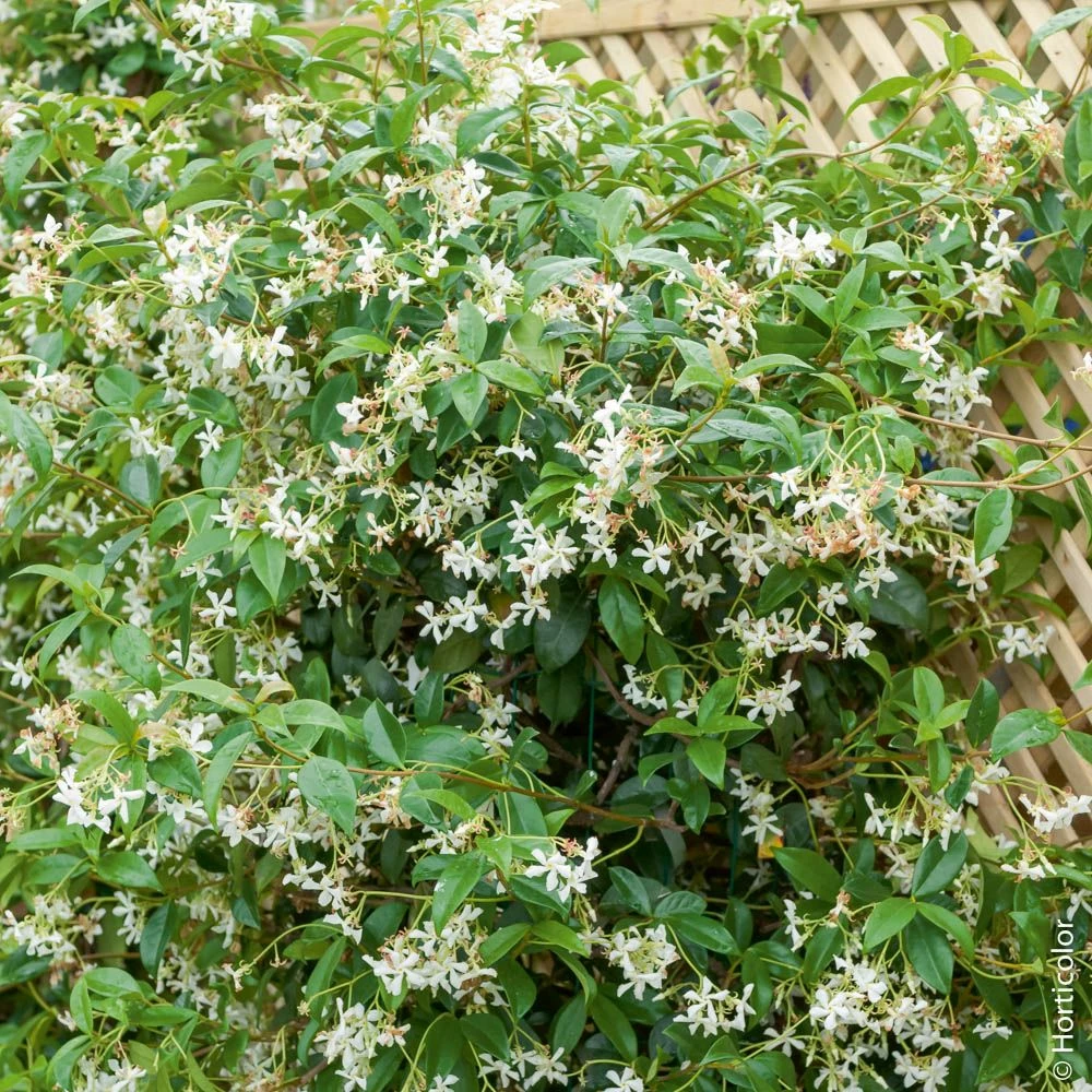 Trachelospermum jasminoides. Jasmin à feuillage persistant vert foncé, brillant, de 5/9 cm de long, pointu aux deux extrémités. Grandes fleurs de 2 à 3 cm de larges, d’abord blanc pur, puis crème, très parfumées d’avril à juillet. Hauteur adulte 5 m et plus. Exposition ensoleillée ou mi-ombragée et protégée.