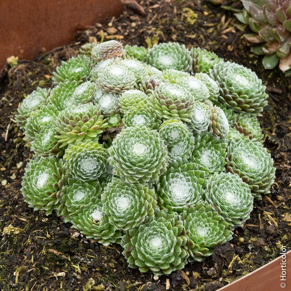 Joli petit bijou précieux, le Sempervivum CHICK CHARMS ® Cotton Candy produit de nombreuses petites rosettes régulières constituées de petites feuilles charnues courtes et pointues imbriquées les unes aux autres. Très original, son feuillage persistant vert plus ou moins nuancé bronze selon la saison étonne par les nombreux filaments cotonneux blancs qui couvrent le centre des rosettes à la façon d’une toile d’araignée.