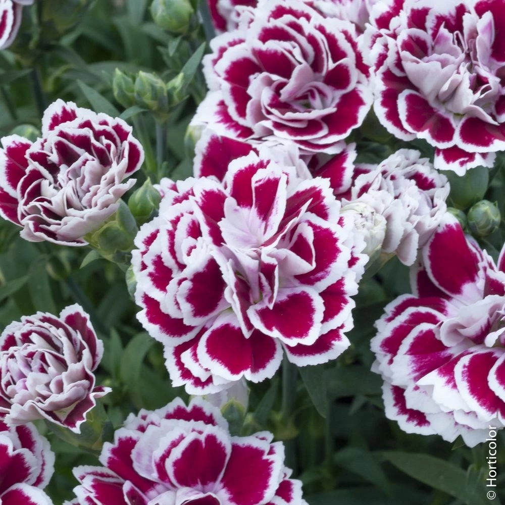 L’œillet nain des Alpes ‘Mendlesham Minx’ offre une floraison prolongée de mai à juillet, avec une légère remontée en septembre si l’on prend soin d’ôter les premières fleurs fanées. Très contrastées, les petites fleurs arrangent leurs pétales finement frangés en corolles semi-doubles, au surprenant coloris rouge grenat foncé presque brun, marginées et panachées de blanc. Leur parfum est particulièrement intense avec des notes épicées typiques.