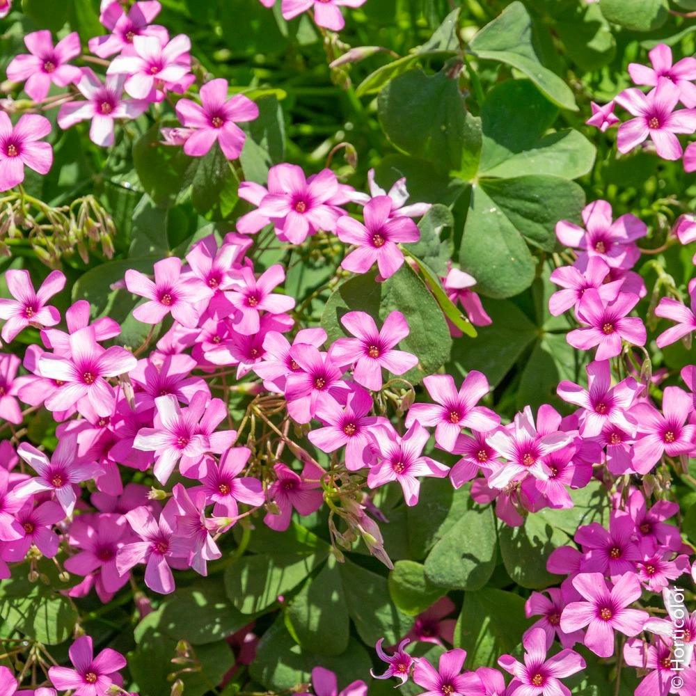 Très généreuse, l’oxalis articulata produit une profusion de fleurs rose vif à 5 pétales soudés, réunies en ombelles lâches à l’extrémité de tiges fines. Si chaque fleur est éphémère, la floraison se renouvelle sans cesse de mai à août, parfois plus longtemps selon le climat !