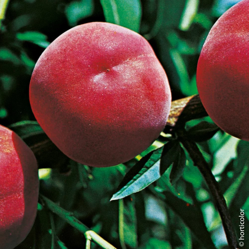 Pêcher à très gros fruits à chair blanche et à épiderme rouge de saveur toujours très douce. Maturité fin juillet. Variété autofertile et de bonne qualité gustative. Mise à fruits 1 à 2 ans après plantation.