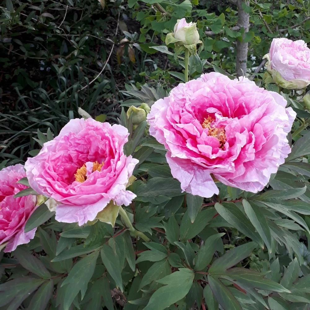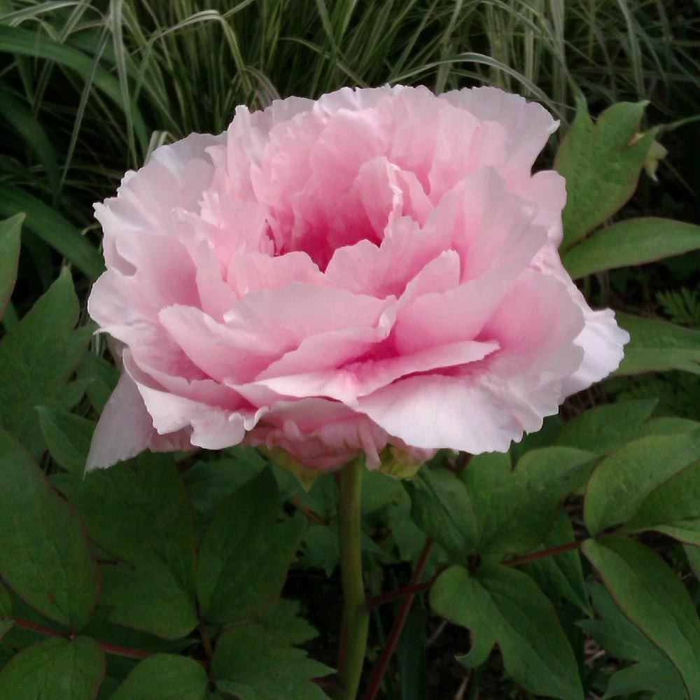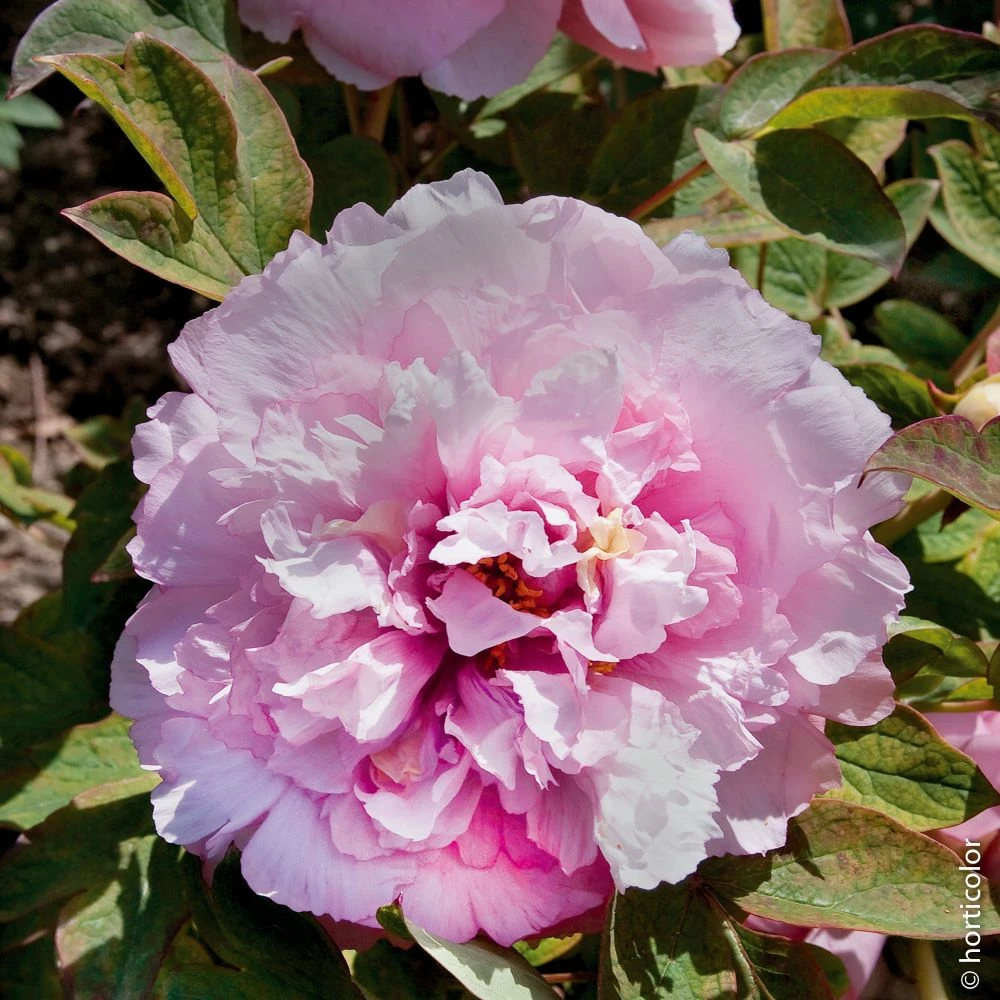 Magnifique arbuste au feuillage caduc. Enormes fleurs semi-double de 23 à 25 cm de diamètre, légèrement parfumées, coloris rose carné clair au centre, argenté sur les bords en avril/mai.