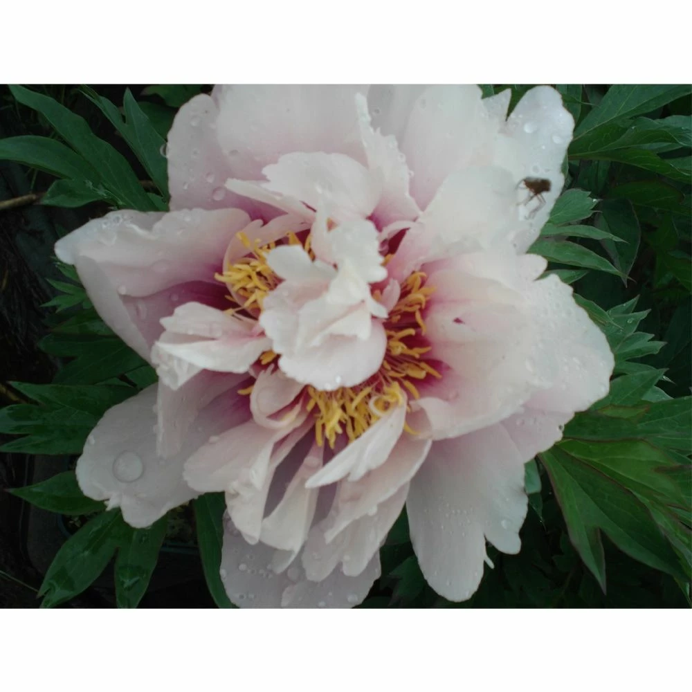 Très florifère, la pivoine Itoh ‘Cora Louise’ s’épanouit au cœur du printemps fin avril-début mai. Elle produit de grandes fleurs semi-doubles de 12 à 15 cm de diamètre, dont les larges pétales blanc rosé nuancé de mauve très clair sont fortement marqué à leur base d’une belle macule contrastée rouge bourgogne.