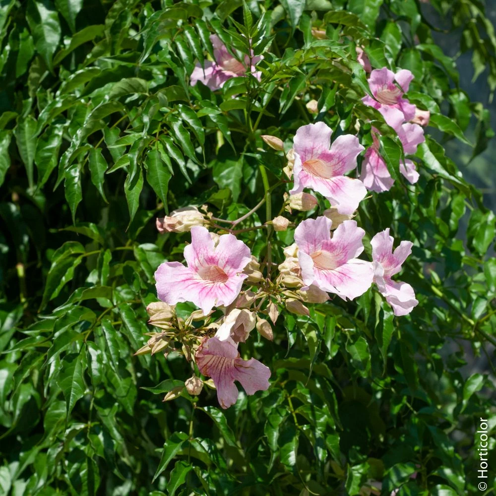 Groupées en grappes retombantes volumineuses, ses superbes et grandes trompettes à gorge soyeuse s’habillent d’un délicieux rose pâle rehaussé de fines veines rose plus soutenu. Elles évoquent les fleurs de la bignone classique (Campsis) d’où son nom courant. Elles exhalent un parfum très agréable.