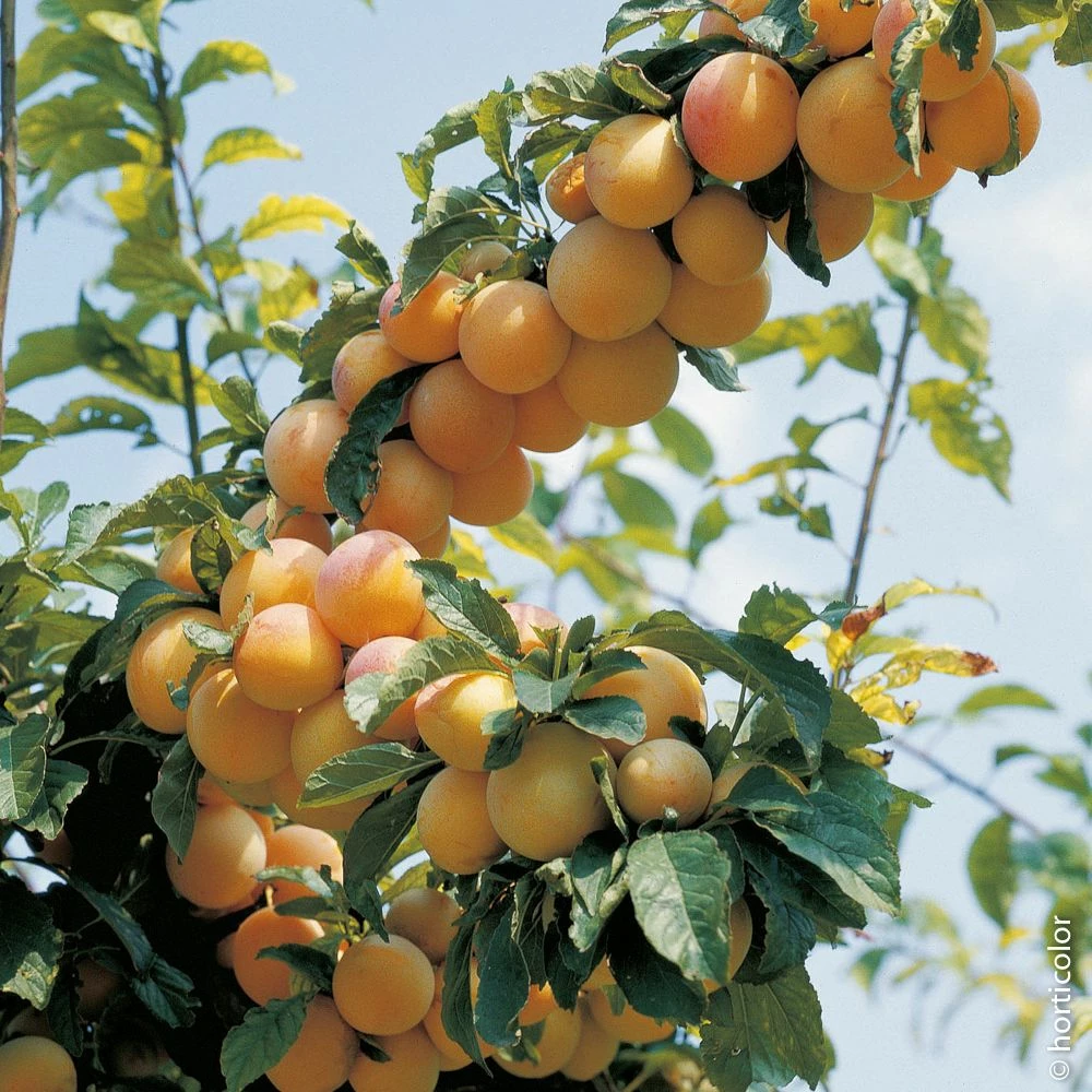 Une avalanche de prunes jaune rosé. Prunier à chair juteuse, bien sucrée et parfumée. Idéal pour les pâtisseries. Maturité mi-août/fin août. Variété autofertile, mise à fruits 2 à 5 ans après plantation.