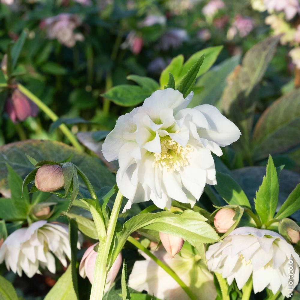 Un peu plus tardive que la rose de Noël classique (H. niger), l’hellébore Double Ellen White fleurit de février jusqu’en avril. Ses tiges florales ramifiées offrent plusieurs boutons qui s’ouvriront les uns après les autres en jolies fleurs doubles qui durent plusieurs semaines. Autour d’un cœur d’étamines jaunes, apprécié des premiers insectes butineurs, s’organisent 2 à 3 rangées de pétales. Blancs, parfois légèrement rosés, ils verdissent progressivement vers la fin de la floraison.
