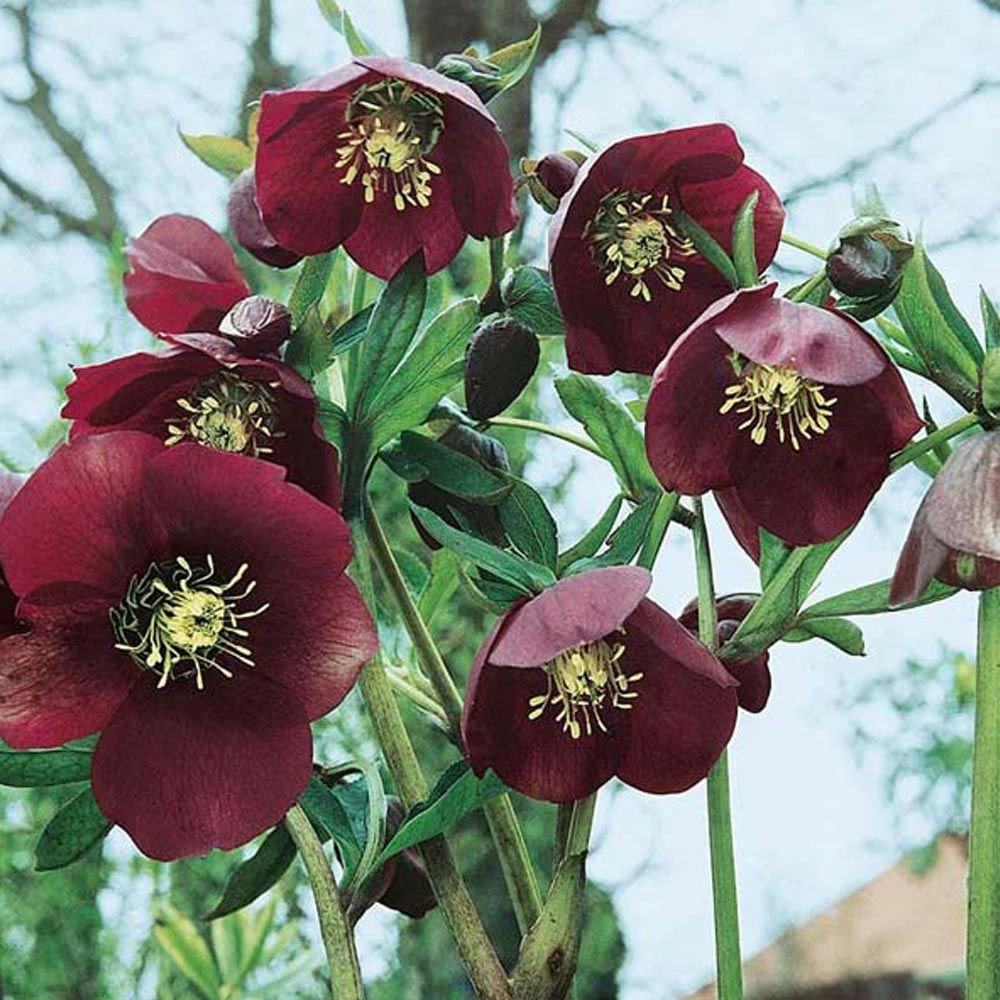 Ces roses de Noël (Hellébores) sont d’un coloris original pourpre foncé à l’extérieur, avec des reflets bleutés, et à l’intérieur vert plus ou moins pourpré. Elles sont parmi les rares plantes qui fleurissent bien à l’ombre. Floraison mars/avril. Pour réaliser de ravissants bouquets. Le feuillage est persistant, vert foncé. Pour tous terrains à exposition ombragée ou mi-ombragée. Espacer de 30 cm ou 9/m². Elle peut également être cultivée en pot. Hauteur adulte 30 cm.