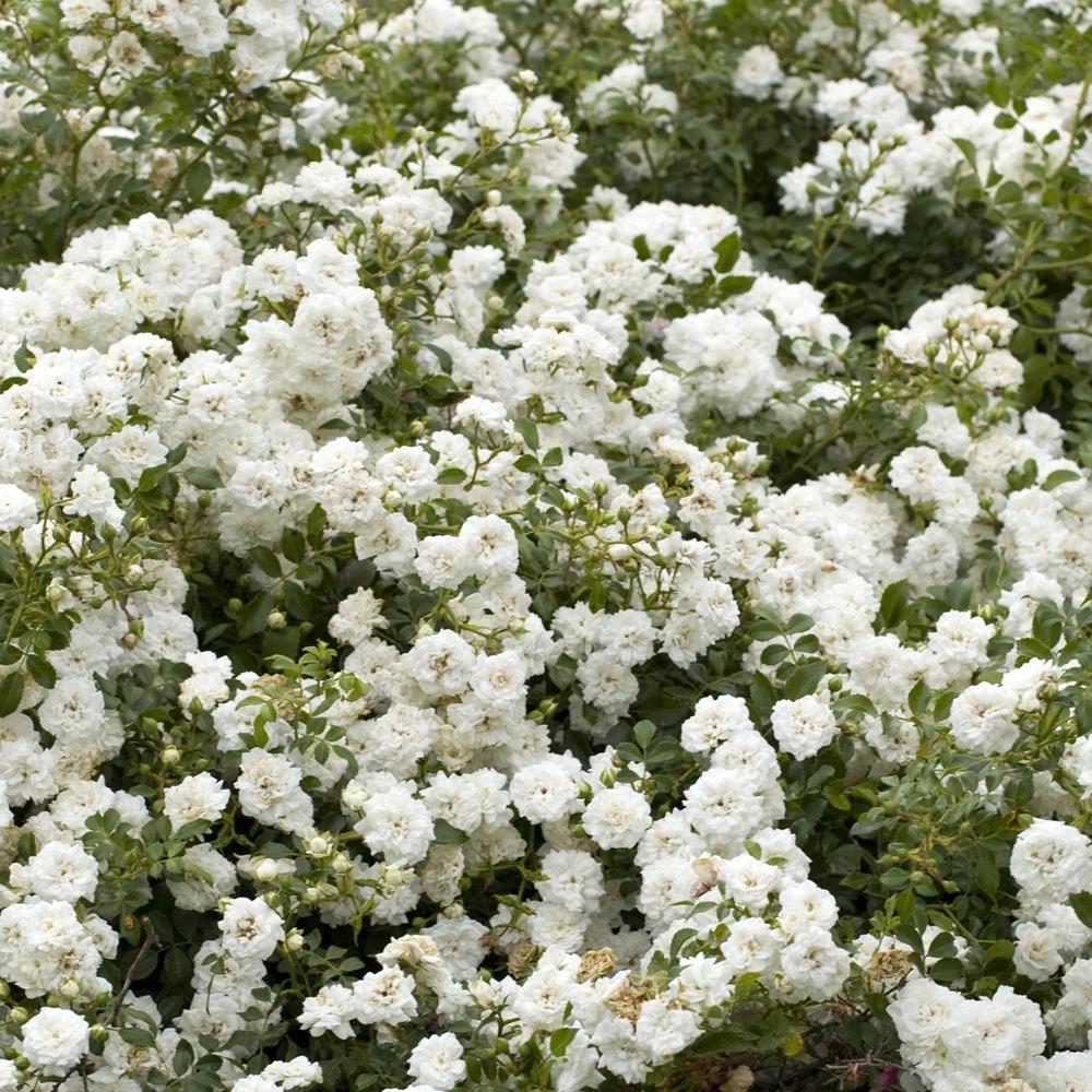 Ses branches souples garnies d’un feuillage très résistant aux maladies portent de juin jusqu’aux gelées de ravissantes petites roses blanches en pompons très doubles.
