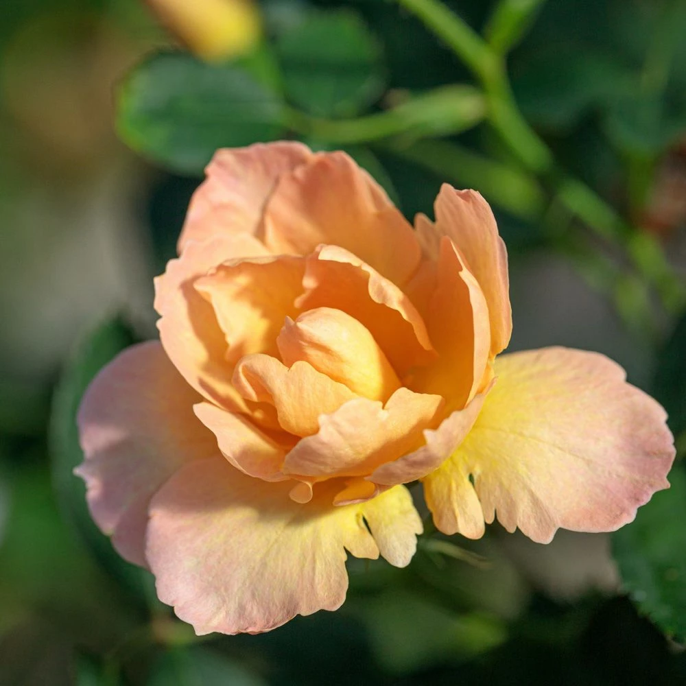 Le coloris, quant à lui, est tout en nuances d’orangé pastel, de rose pêche et de blanc crème, évoluant au fur et à mesure de l’épanouissement des roses. Cet aspect changeant confère à l’arbuste en pleine floraison un aspect de coussin bicolore.