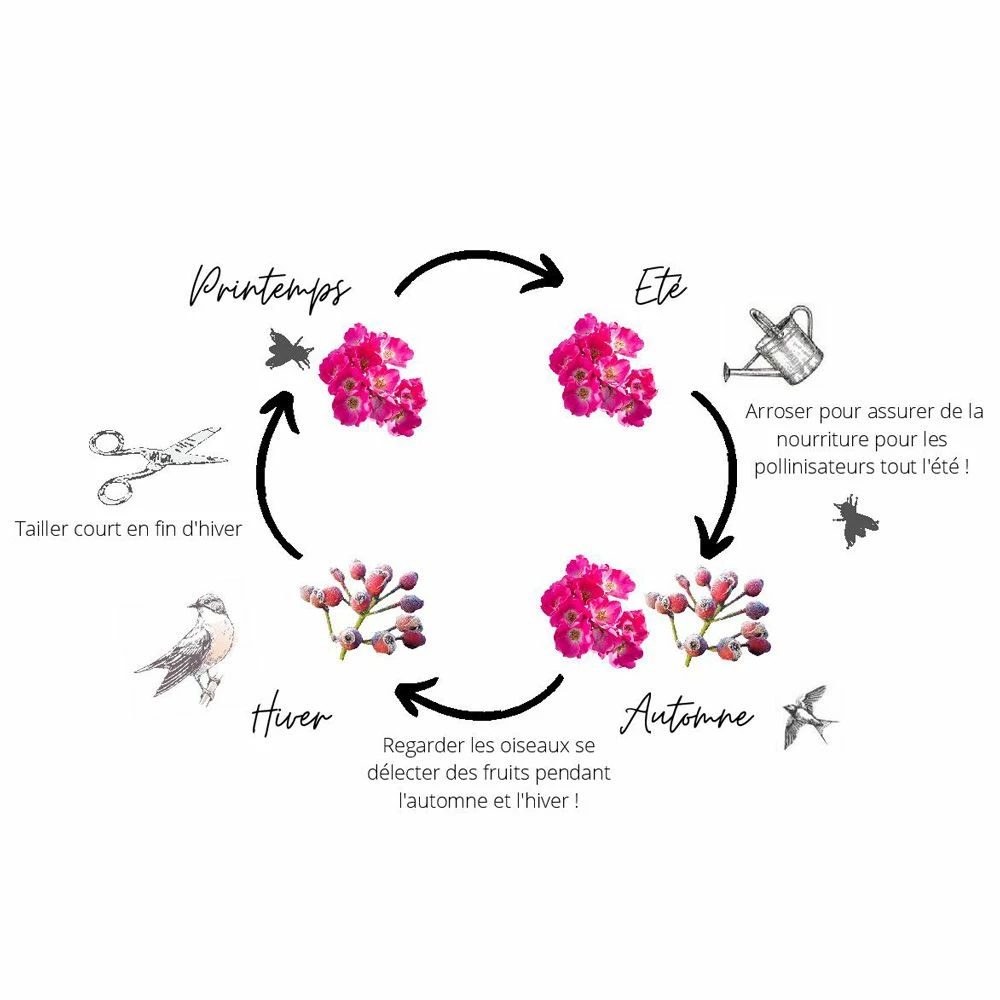 Souvent cohabitent simultanément fleurs et fruits ! Cette fructification généreuse procure une source de nourriture appréciée des oiseaux tels que les merles, grives, étourneaux, etc. durant l’automne et l’hiver.