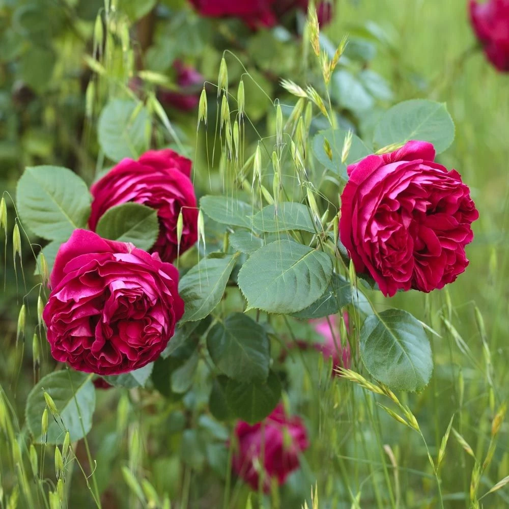 Le rosier grimpant ERIC TABARLY Meidrason produit de nombreuses fleurs généralement groupées en bouquets de 2 à 5 roses. Les gros boutons globuleux s’épanouissent lentement jusqu’à former une rose en coupe creuse d’environ 10-11 cm de diamètre. Les roses comptent une centaine de pétales très serrés, organisés en quartiers tourbillonnants à l’image des roses anciennes. Elles ont choisi un rouge pourpré très foncé, presque lie-de-vin, pour habiller leurs pétales soyeux. Les roses émettent des effluves typiques de Rose de Mai, parfois peu perceptibles à l’extérieur, mais capables de parfumer une pièce lorsqu’on coupe les fleurs pour les mettre en bouquet.