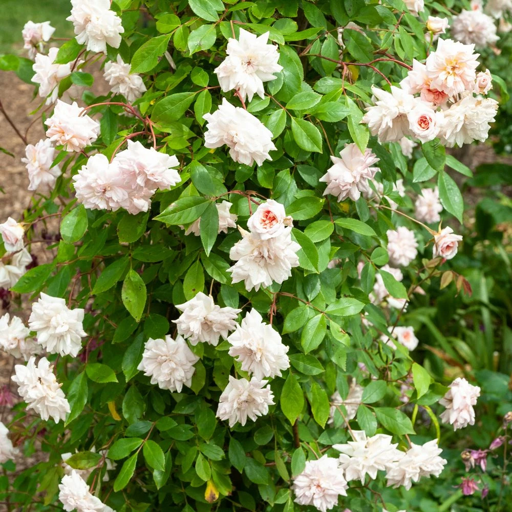 D’une perfection rare en bouton, ses petites roses élégamment turbinées éclosent en rosettes doubles et chiffonnées d’environ 3 à 4 cm de diamètre, comptant en moyenne 30 pétales. Leur teinte délicate rose argenté frais s’éclaircit en rose nacré en plein épanouissement. Généralement groupées en bouquets gracieux de 2 à 10 fleurs, elles répandent un agréable parfum doux et légèrement épicé aux notes de muguet, de poivre et de thé. Coupées, elles composent de splendides bouquets pleins de charme et ont longtemps été utilisées en boutonnière à l’occasion de cérémonies.