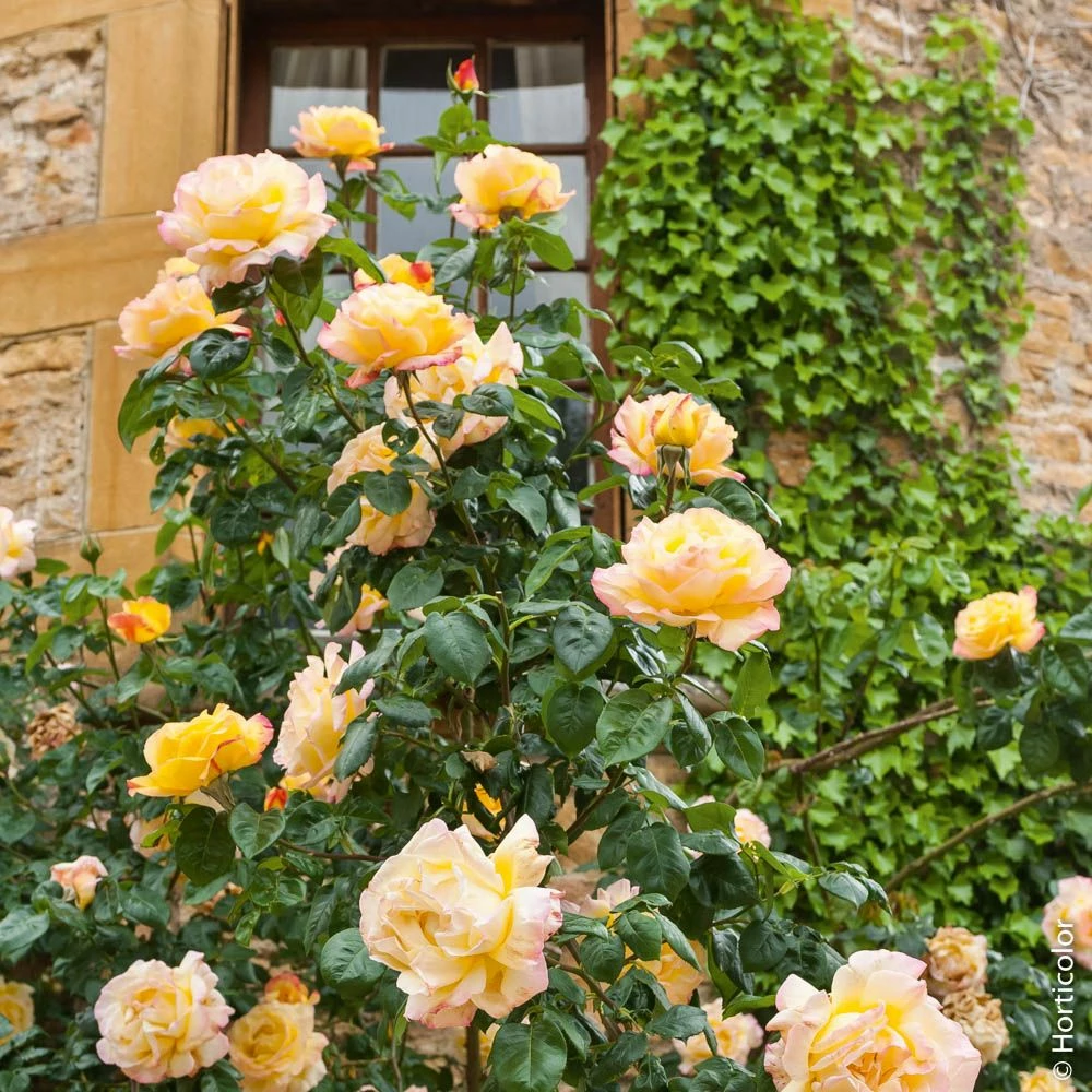 Rosier grimpant à grosses fleurs jaune canari bordées de carmin, très vigoureux à grand développement, pouvant couvrir près de 15 m². Fleur de 40/45 pétales.
