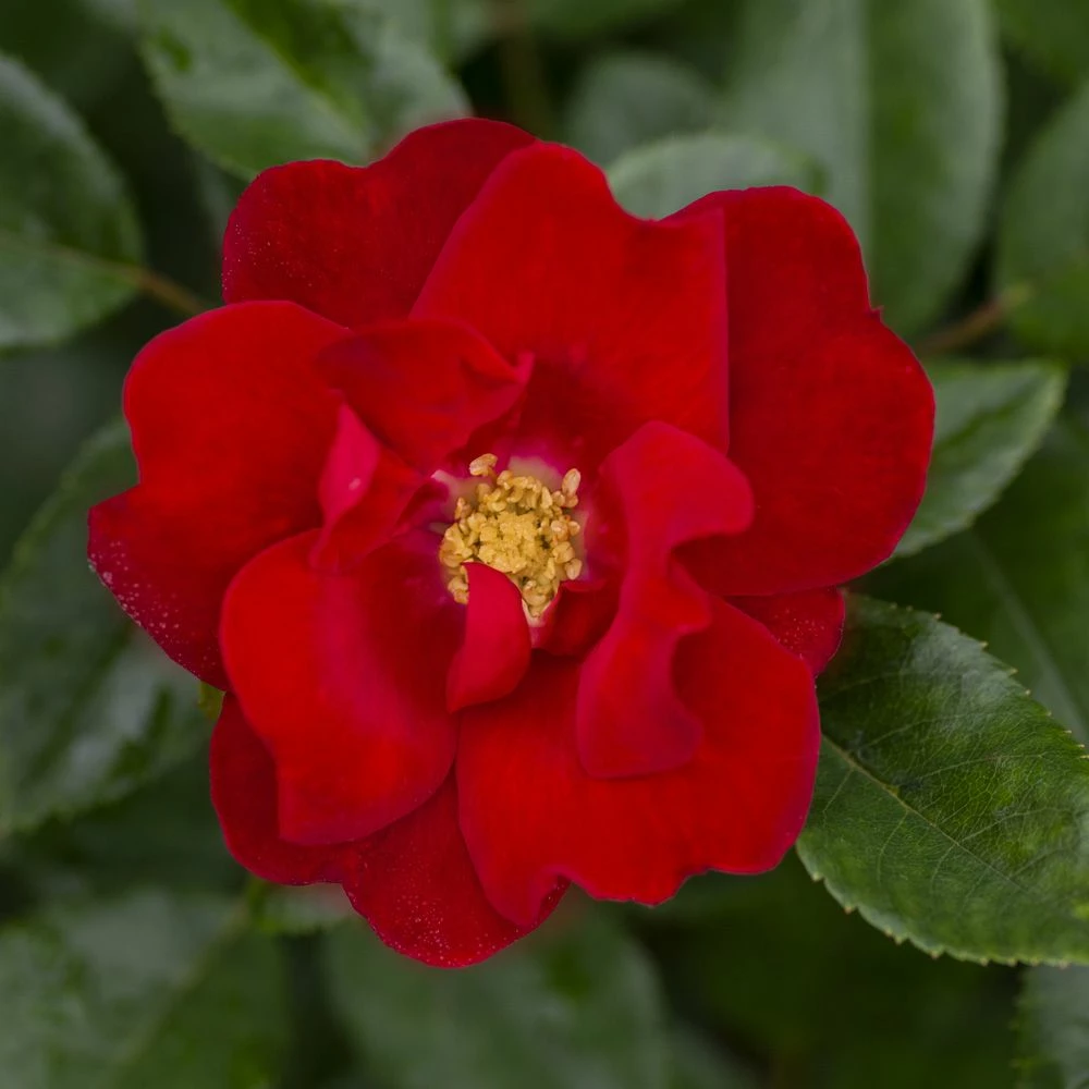 Elles laissent voir leur cœur contrasté d’étamines dorées très attractif pour les abeilles et autres pollinisateurs. Ses pétales rouge foncé se nuancent parfois sur les bords de reflets fumés sous l’action du soleil et de la chaleur, apportant à chaque rose un relief particulier.