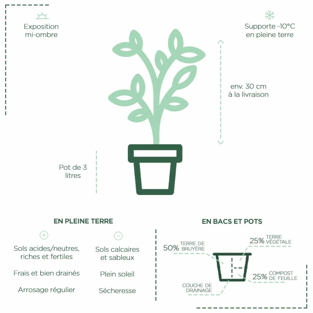 Le théier ThéOjardin ® est livré en pot de 3 litres, avec une hauteur d’environ 30 cm à la livraison, avec étiquette d’informations et de conseils (chromo)