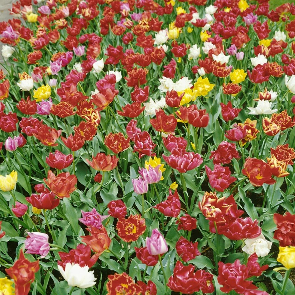 Tulipes doubles à fleurs de Pivoines en mélange. Floraison tardive : mai. Hauteur adulte : 40/50 cm. Calibre : 11/12. Distance de plantation : 12/15 cm.